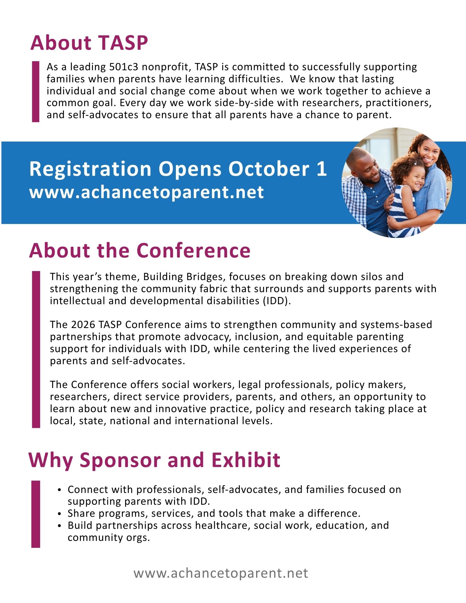 The 2026 TASP Conference offers social workers, legal professionals, policy makers, researchers, direct service providers, parents, and others, an opportunity to learn about new and innovative practice, policy and research taking place at local, state, national and international levels, and will include plenary sessions highlighting inclusive and interdisciplinary practices to create positive outcomes for families.